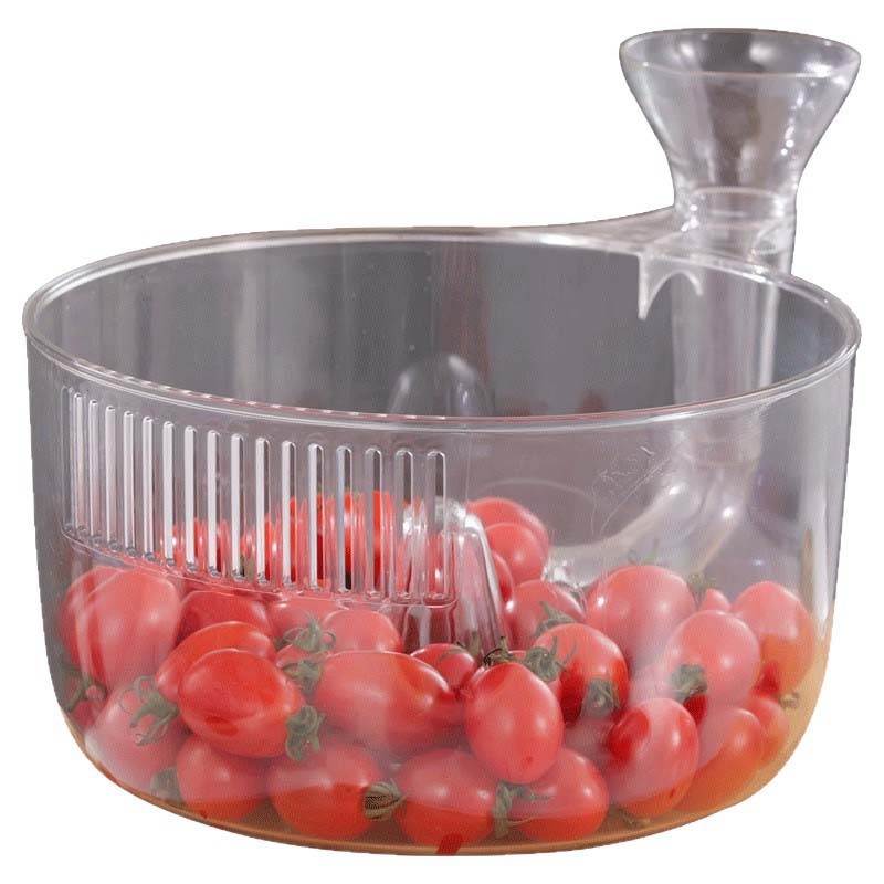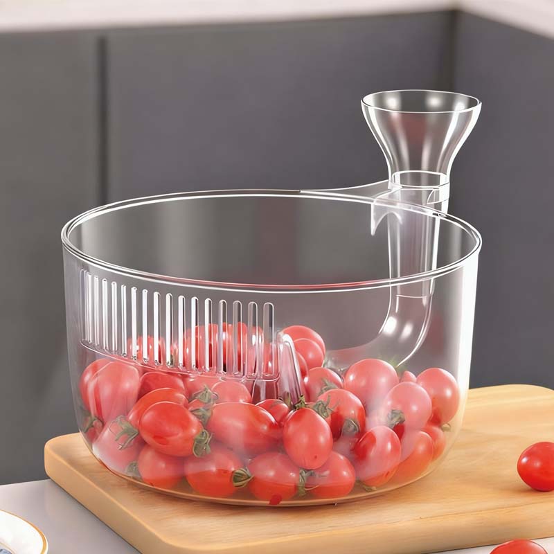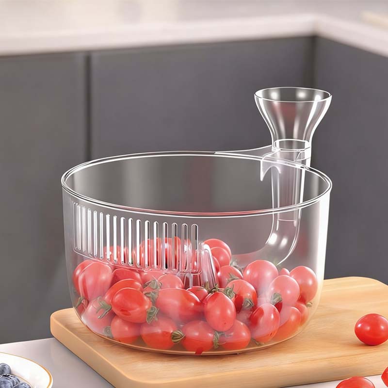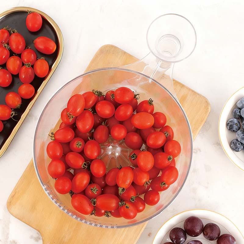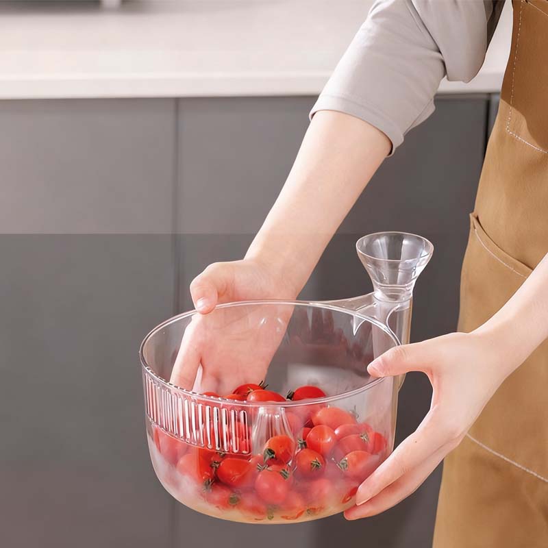 A mosás és a lecsepegtetés egy sima mozdulattal elvégezhető. A belső kosár szabadon forog, így a tiszta termékek azonnal elválnak a szennyezett víztől. Ez a kialakítás szükségtelenné teszi a több edény használatát, gyorsítja az előkészítési időt, és minden étkezéshez rendezett, hatékony munkaterületet biztosít.