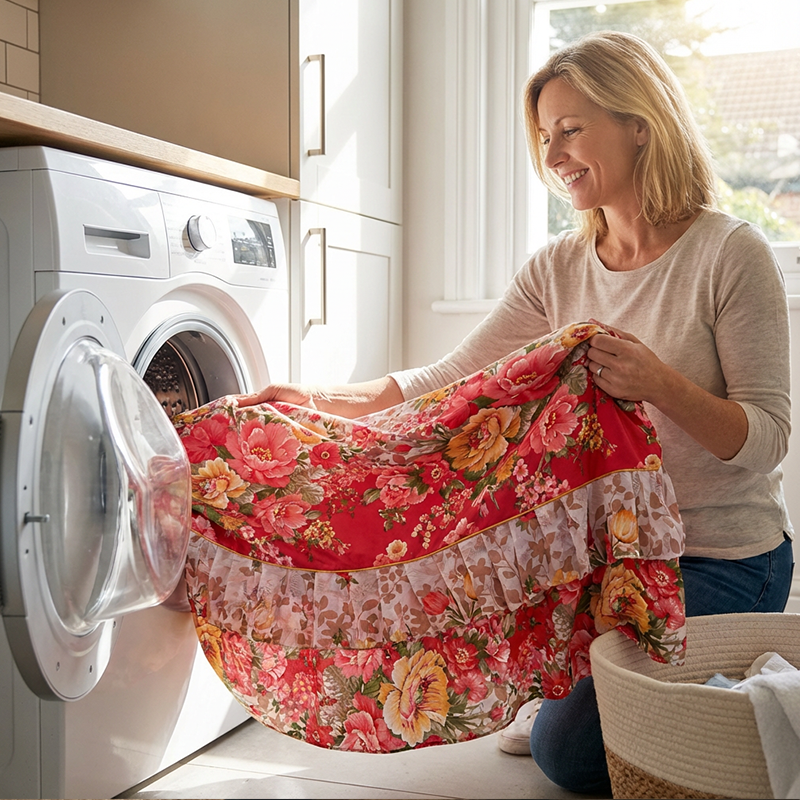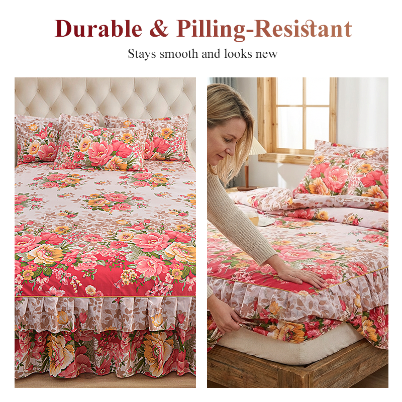 A kecsesen hullámzó, fodros szoknya kifinomult bájt kölcsönöz hálószobájának, réteges, dizájneres megjelenést teremtve, miközben stílusosan elrejti az ágy alatti tárolóteret, így rendezett képet nyújtva.