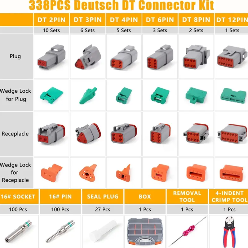 SZÉLESKÖRŰ KOMPATIBILITÁS – A DT, DTM, DTP, DRB, DTV és STRIKE sorozatú Deutsch csatlakozókkal kompatibilis szerszámkészlet elengedhetetlen az építőiparban, teherautókban, buszokban, mezőgazdaságban, bányászatban és más területeken.