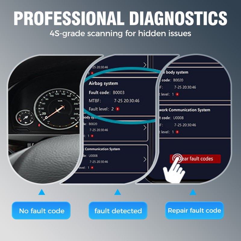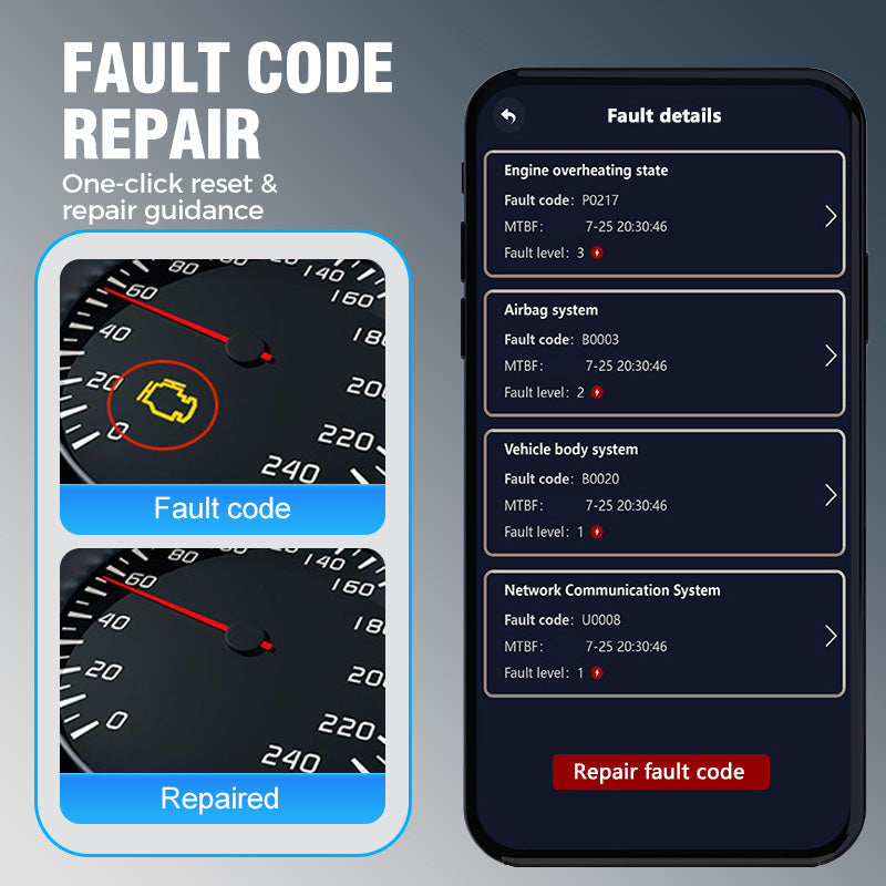 HIBAKÓD JAVÍTÁS – Törli a hibakódokat, visszaállítja a figyelmeztető lámpákat, és javítási javaslatokat ad, például a laza vezetékek javítását – így egy egyszerű kattintással megspórolhatja a szerelőhöz való utazást.