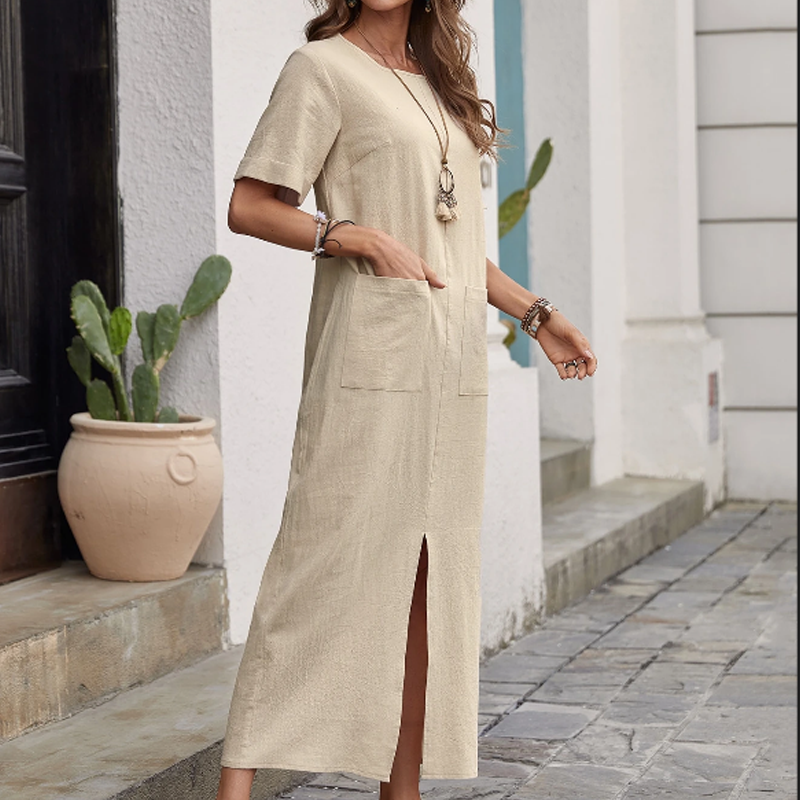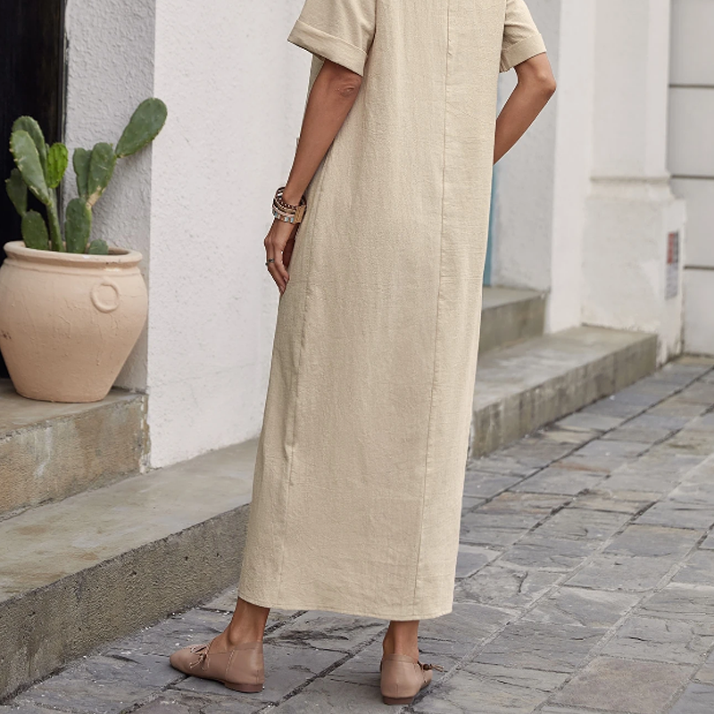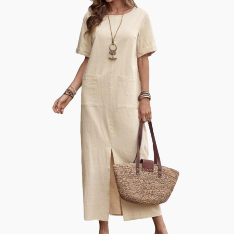 KĂNYELMES ĂS LĂLEGZĆ â A kivĂĄlĂł minĆsĂ©gƱ pamut-vĂĄszon keverĂ©kbĆl kĂ©szĂŒlt ruha rendkĂvĂŒl puha, bĆrbarĂĄt kĂ©nyelmet Ă©s kivĂĄlĂł lĂ©gĂĄteresztĆ kĂ©pessĂ©get biztosĂt. Az anyag termĂ©szetes textĂșrĂĄja biztosĂtja a könnyed lĂ©gĂĄramlĂĄst, Ăgy nyĂĄron hƱvös marad Ă©s egĂ©sz nap kĂ©nyelmes - anĂ©lkĂŒl, hogy a szerkezet vagy a stĂlus rovĂĄsĂĄra menne.