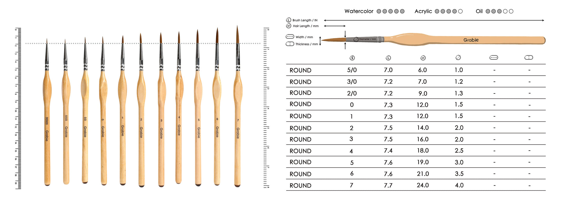 Ez a termékcsalád széles méretválasztékot kínál (5/0, 3/0, 2/0, 0, 1, 2, 3, 4, 5, 6, 7), hogy minden festő igényeit kielégítse a részletek festésére alkalmas ecsetek terén.