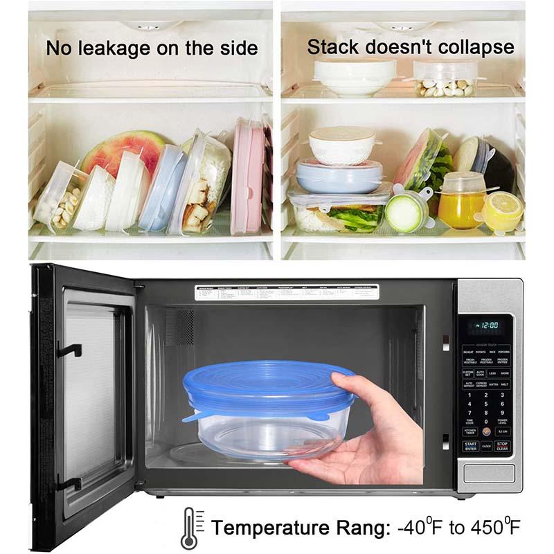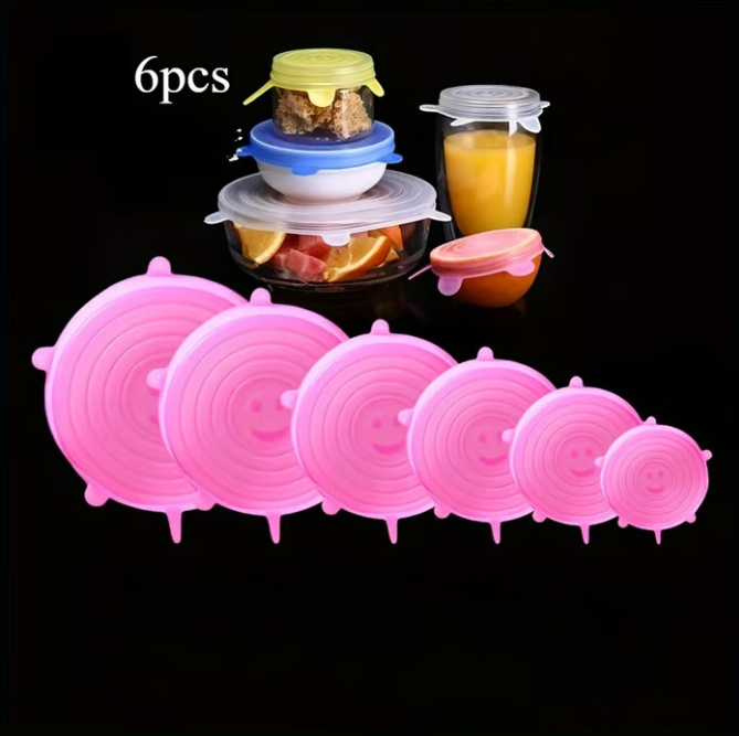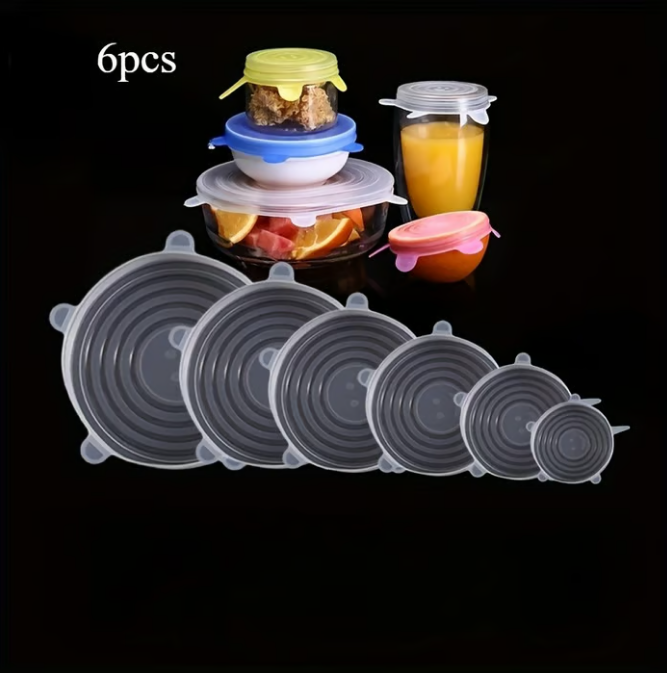 Ezek a szilikon fedelek rendkívül rugalmasak és elasztikusak, 6 különböző méretben kaphatók (2,5 hüvelyk, 3,7 hüvelyk, 4,4 hüvelyk, 5,5 hüvelyk, 6,2 hüvelyk, 7,8 hüvelyk), rugalmasságuk megduplázódhat. Alkalmasak poharakhoz, üvegekhez, négyzetes és kerek tálakhoz, valamint gyümölcsökhöz. Használat előtt győződjön meg arról, hogy a fedél és a tartály teljesen száraz, hogy a szélek szorosan illeszkedjenek egymáshoz.