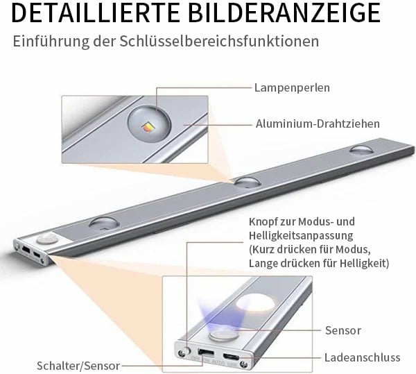 â€ïžUSB wiederaufladbar und energiesparend: Diese batteriebetriebenen LED-Leuchten verfĂŒgen ĂŒber einen integrierten wiederaufladbaren Akku mit hoher KapazitĂ€t, der einfach ĂŒber das USB-Kabel (im Lieferumfang enthalten) aufgeladen werden kann. Nach dem vollstĂ€ndigen Aufladen funktioniert die kabellose Unterschrankbeleuchtung 60 Tage lang im Bewegungssensormodus (G) (10 Mal am Tag aktivieren).