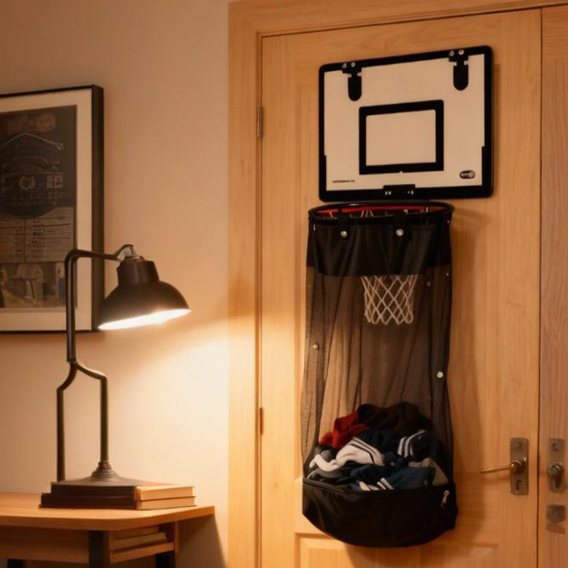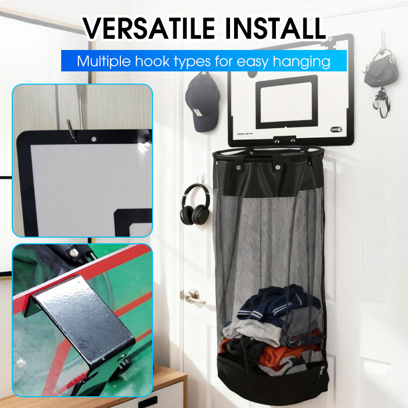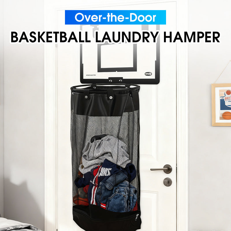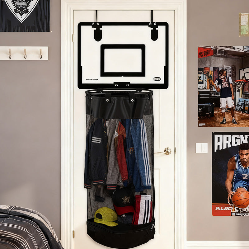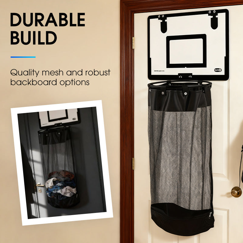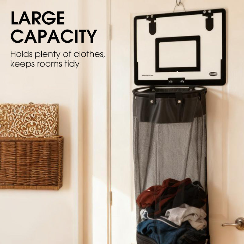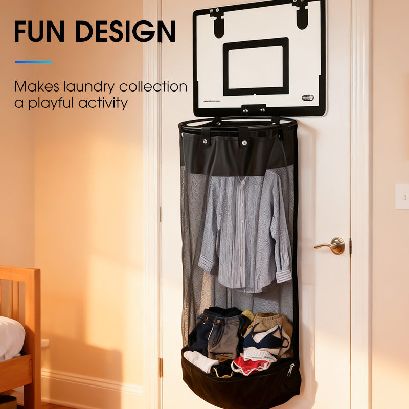 EGYEDI KOSÁRLABDA-TERVEZÉS: Ez a kreatív, ajtóra akasztható szennyestartó kosárlabda palánkkal van ellátva, így a szennyes ruhák elhelyezése is szórakoztatóvá válik. A takarítás minden korosztály számára szórakoztató és interaktív játékká válik.