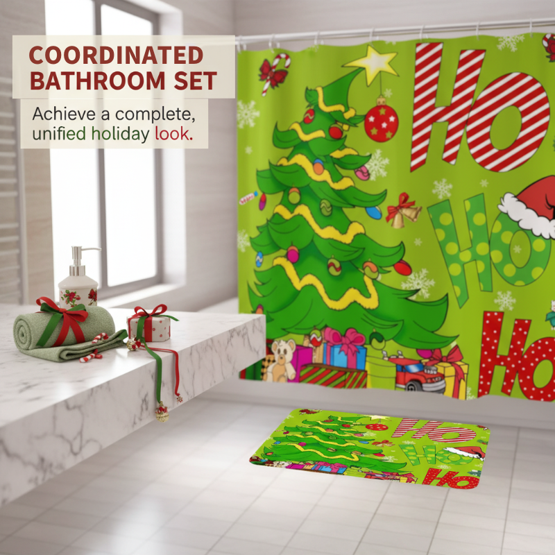 TELJES, ÖSSZESZABOTT KÉSZLET - Könnyedén hozhat létre tökéletesen összeillő ünnepi hangulatot. Ez a szett minden szükséges elemet tartalmaz az egységes stílus kialakításához, beleértve a zuhanyfüggönyt, a WC-fedélhuzatot, a fürdőszoba szőnyeget és a kontúrszőnyeget.